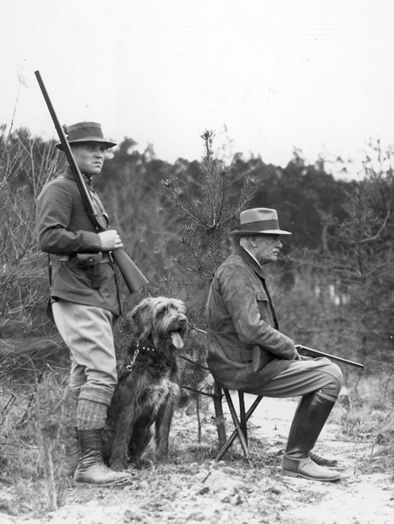 Prezydent RP Ignacy Mościcki na stanowisku w towarzystwie łowczego i wyżła